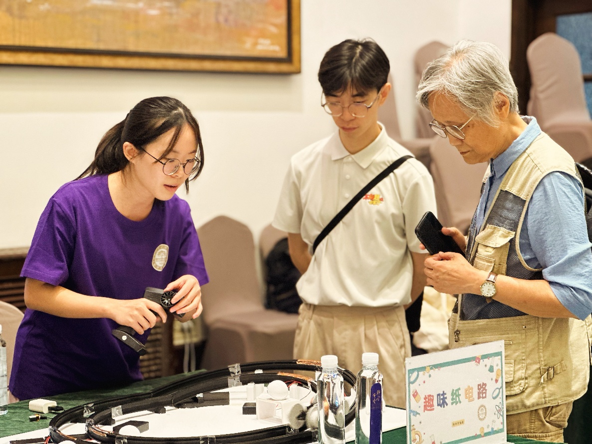 在趣味纸电路主题专区内,青少年们可以体验到“闪电捶捶乐”装置与“火车过弯”,前者巧妙地结合了手工趣味与基础电路知识,既训练反应力又生动演示了电流回路原理,后者通过节节轨道拼接,圈圈电路相连,通过不同电灯的亮暗瞬间来揭开火车过弯轮轨受力奥秘。在神奇电磁魔法主题专区内,通过电磁感应实验装置等,青少年亲身体验“隔空取电”、放电等奇妙现象,在游戏中了解电与磁的基本规律,激发对物理世界的好奇与探索欲。在“反重力”悬浮主题专区内,同学们亲手操控“旋转酒杯”、“珠链喷泉”、“下悬磁球”、“不倒空竹”等装置,感受物体“摆脱”重力的神奇瞬间,埋下未来深究科学奥秘的种子。在伯努利马戏团主题专区内,气球组成的“风火轮”在吹风机下旋转、乒乓球在高速气流中如机关枪一样快速射出,生动展示了生活中的伯努利原理,使得青少年们在轻松愉快的氛围中,体会流速与压强的关系,了解生活现象背后的科学原理。